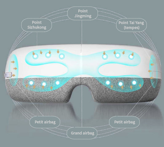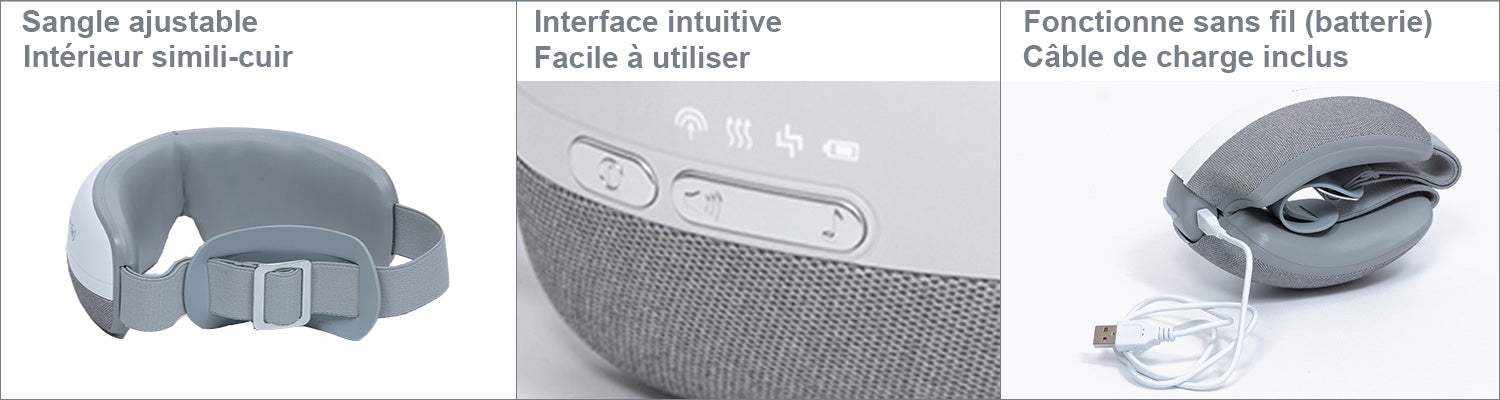 - Vibrations ciblées : stimulation des zones réflexes autour des yeux et des tempes pour une détente profonde et un effet anti-fatigue immédiat.